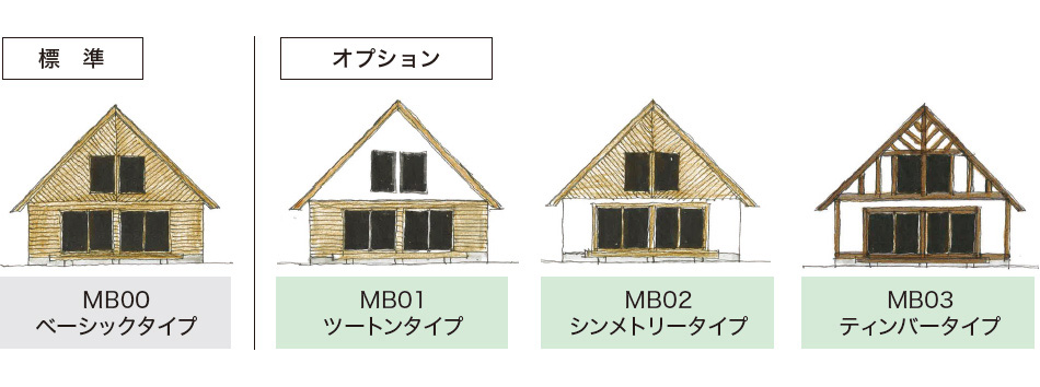 オーナーの趣味やライフスタイルに合わせて 部屋を増やせるベースプラン。 容易に間取り変更できる耐久性の高い強靭なスケルトン(構造体)と、 雪や枝葉が落ちやすい機能的な 三角屋根のプロポーションが特徴です。