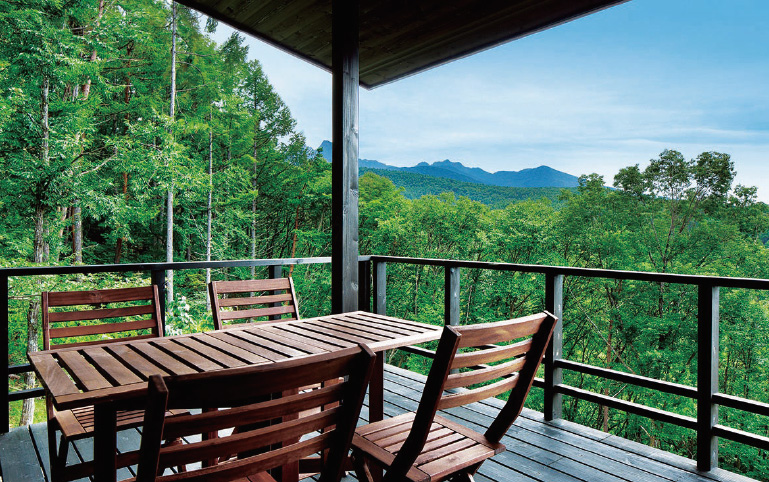 眼下に森が広がる展望台感覚の2階サンデッキ。晴れた日には、八ヶ岳連峰の雄大な稜線が手の届きそうな場所に広がる