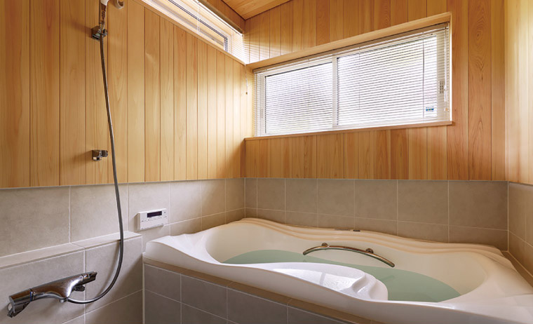 節のないヒノキを張り詰めたバスルーム。清々しい空間でリラックスできる
