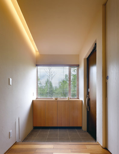 間接照明を採用し、天井面がすっきりとした玄関ホール。床のフローリングと同色のシューズキャビネットを造付け、統一感を持たせている
